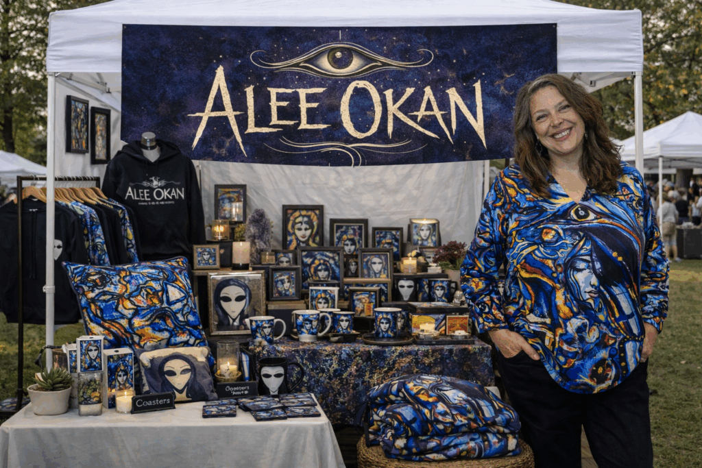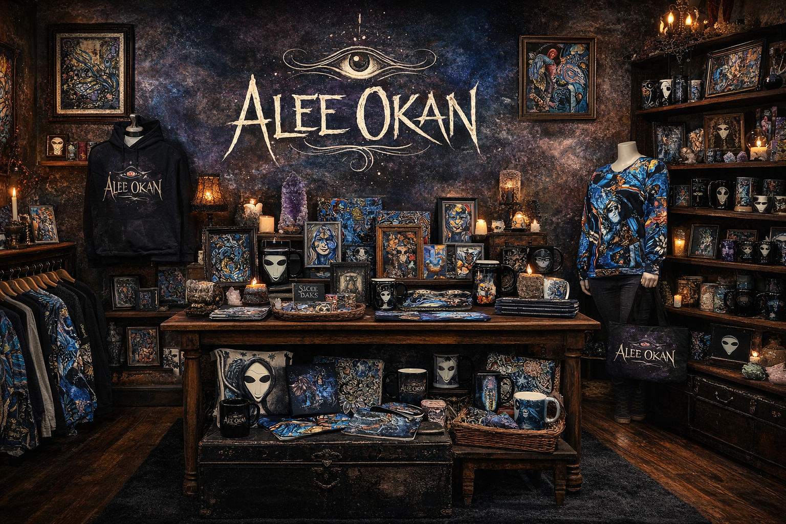 Welcome to the Alee Okan Gift Shop. explore art-inspired apparel, home goods, and collectible pieces drawn from Alee’s original paintings.